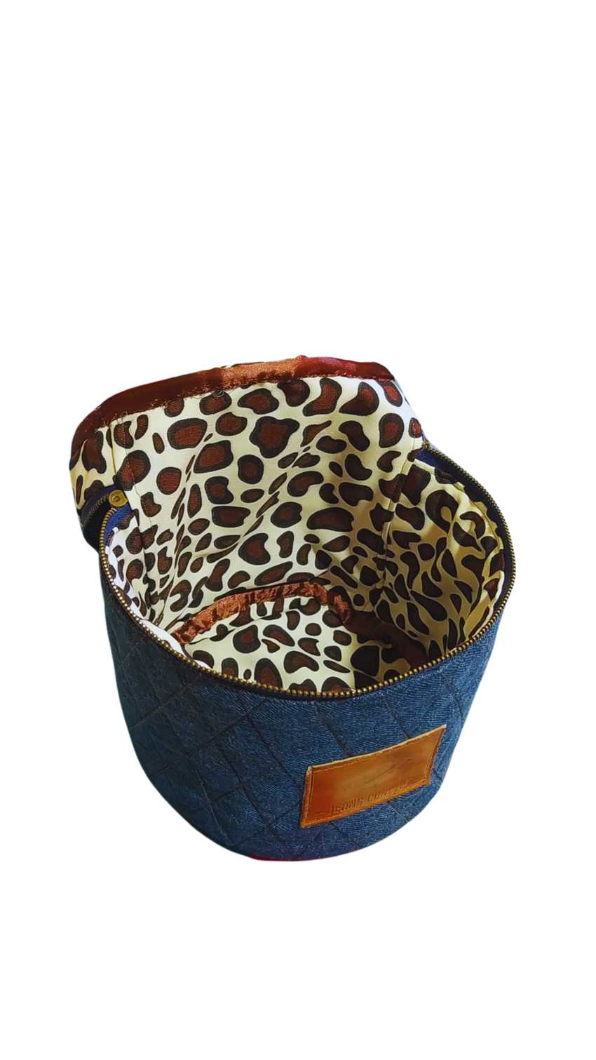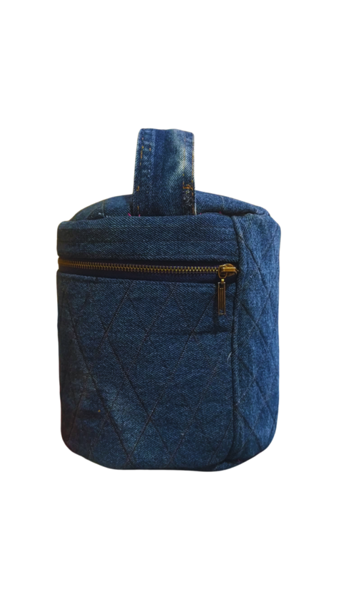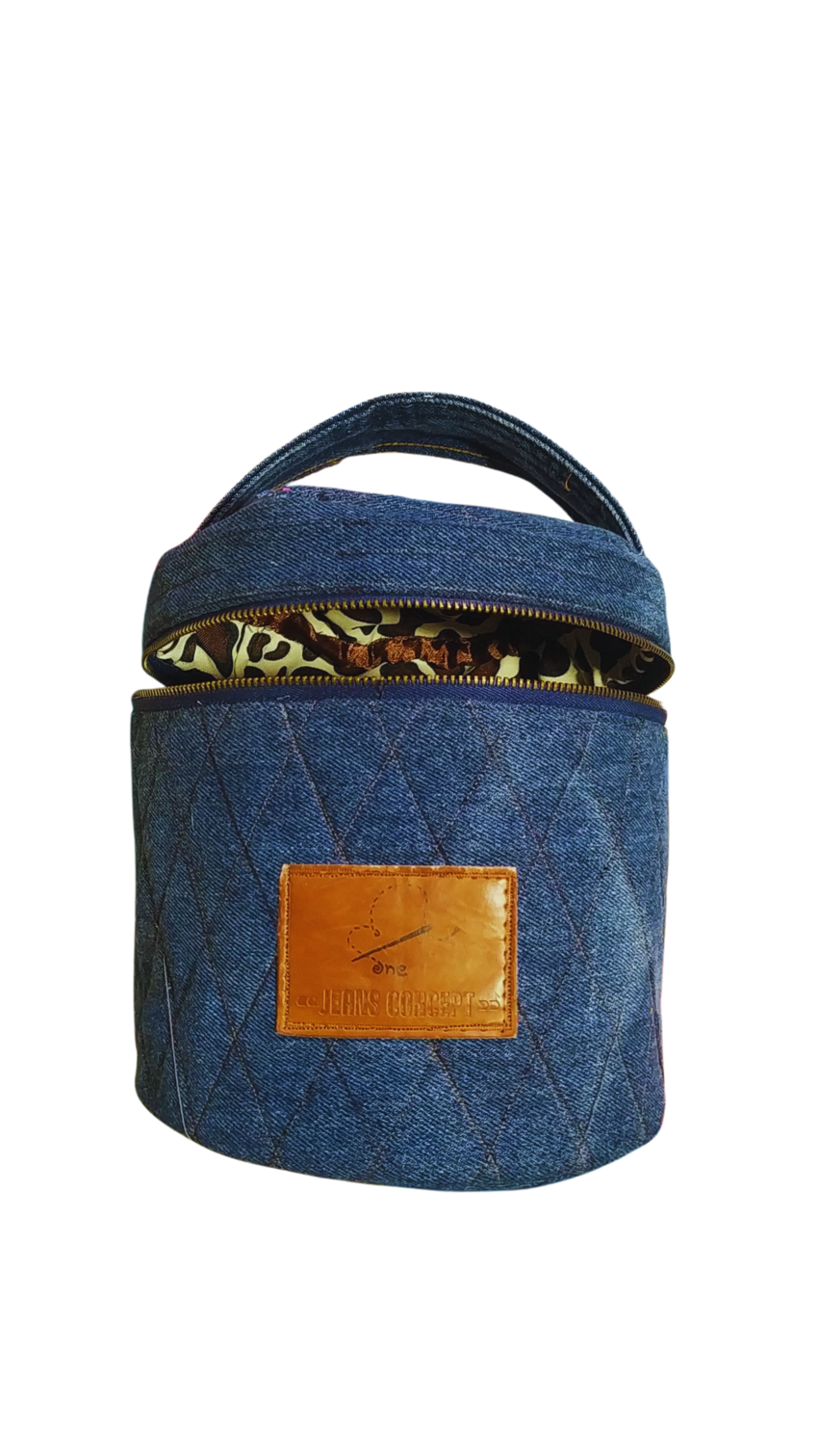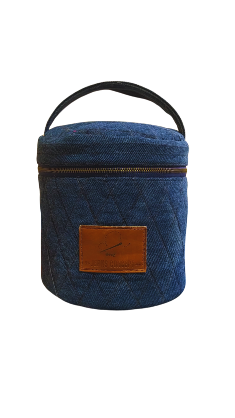 Bolso de mano formato lonchera. Detalles de bordado geométrico, forro interior con bolsillo. Cierre mediante cremallera.